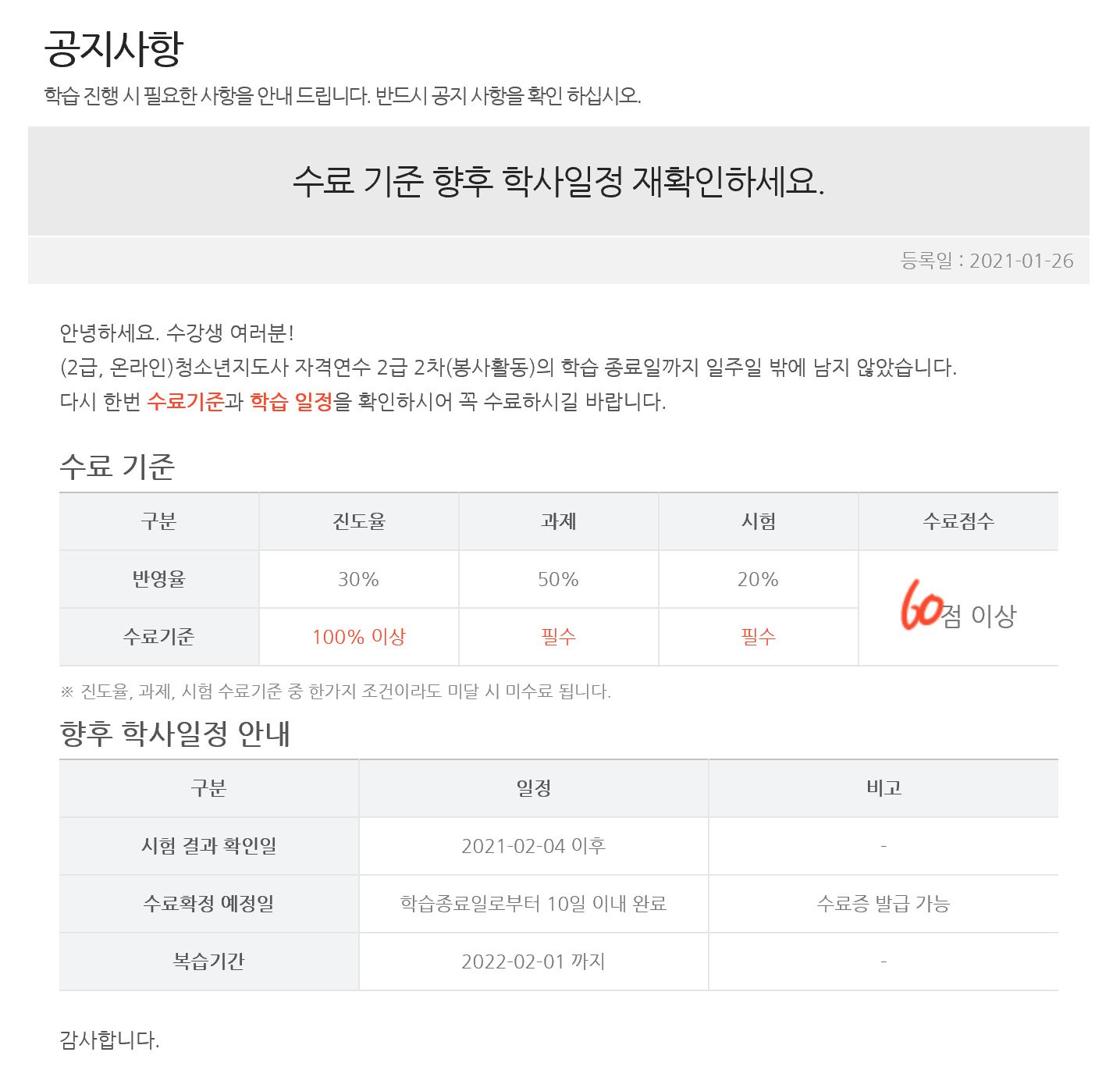 진도 100%, 과제, 시험 모두 필수에 수료 점수 60점이 기준입니다.