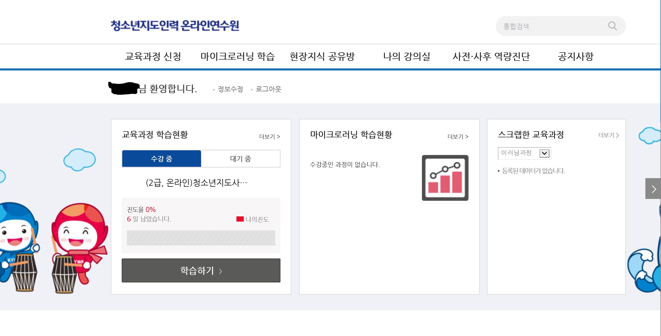위의 청소년지도사 교육연수원 사이트에 들어가서 로그인하면...